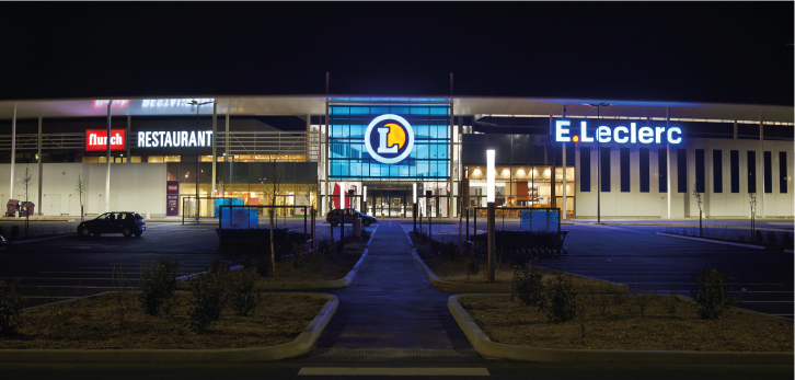 Problématique : Réaliser des travaux courants forts, faibles et GTB (2,2M€) Besoins et demandes du client : Construction d’un hypermarché et d’une galerie marchande de 40 boutiques Contraintes : - Intervention de nombreuses sociétés pendant les travaux - Délais de 16 mois Solutions et Prestations : - Installation de chantier, 2 postes de livraison HT 630 Kva, 2 TGBT, 2 TGS, 25 armoires. - Éclairage de surface de vente, galerie marchande, réserve et parking. - Éclairage de secours par source centrale. - Alimentation des labos et équipement de production chaud, froid. - Installation de baie informatique et précablâge informatique, 4 tarifs jaune galerie marchande 160 Kva / 240 Kva, 36 tarifs bleu.