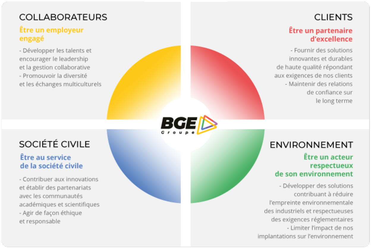 Le Groupe BGE est porteur de valeurs professionnelles et humaines fortes, que nous défendons au quotidien dans nos métiers. Nous prônons des valeurs fortes telles que la sécurité, la réactivité, la qualité, la disponibilité, la proximité dans chacun de nos domaines d’expertise.